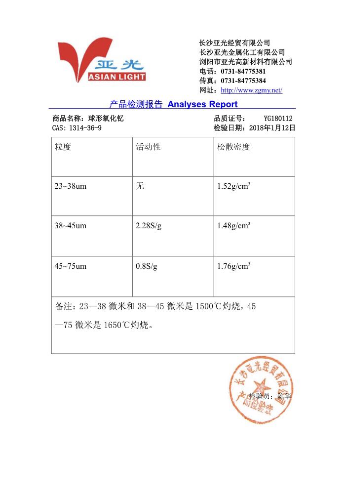 我公司根椐客戶要求最新研究出造粒5N氧化釔,粒徑20-100微米(可以根據(jù)用戶要求 篩分分級供應(yīng)),主要用于電子噴涂(設(shè)備零件生產(chǎn)時電鍍用),質(zhì)量保證,歡迎聯(lián)糸和試用選購。